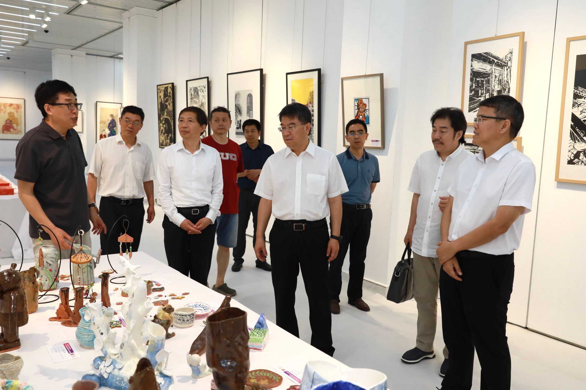 张京泽、郭广生一行认真观看了毕业生创作的不同主题作品,了解了各类作品的设计背景、作品内涵、专业特色等,亲切地询问了首届师范生的升学、就业情况,对美术学院的教学成果和毕业生展出作品给予了充分肯定。