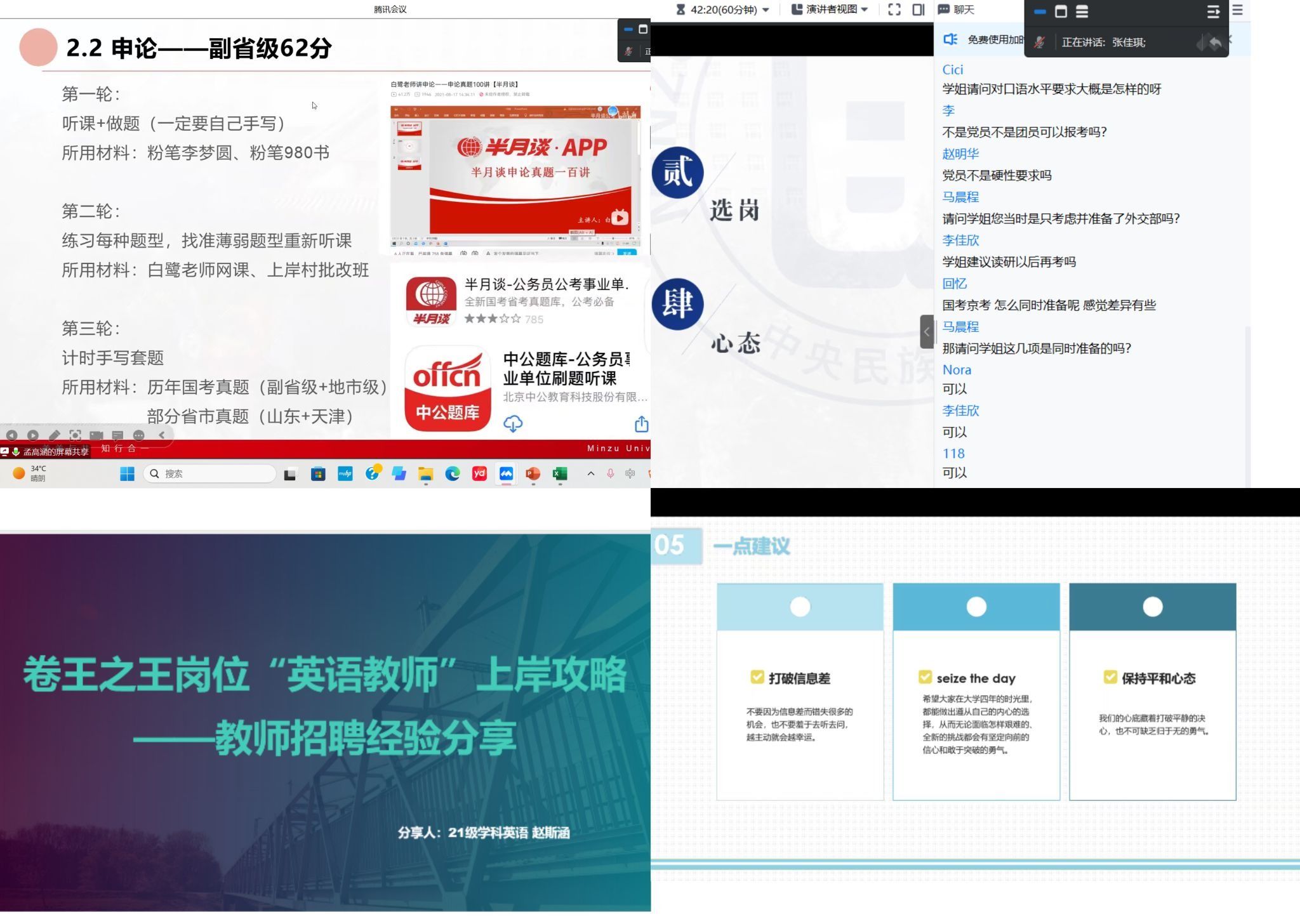 榜样力量,提升育人成效。榜样是一座灯塔,指引方向,各学生党支部积极推进“朋辈引领”成长接力工程。6月15日至20日期间,18名优秀毕业生党员聚焦保研、考研、选调生、公务员等专题,举办9个专场交流会,累计参加学生达300人次。此次交流会,不仅帮助同学们全方位、多层次地了解就业信息和职业发展前景,也引导学生树立正确的就业观、择业观。