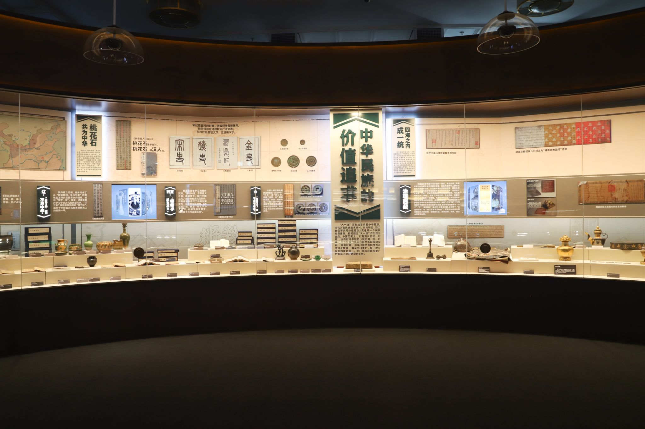 展览分为“大一统”、“大交融”、“大团结”三个单元。“大一统”单元从思想理念、制度实践、价值追求三个维度展现中华民族和中华文明延续不断的历史基因;“大交融”单元从文化上的兼收并蓄、经济上的相互依存、情感上的相互亲近三个方面展现中华民族在交往交流交融中发展壮大的脉络和凝聚不散的历史密码;“大团结”单元展现中国共产党从成立至今一脉相承的中华民族大团结的深邃思想与丰富实践。